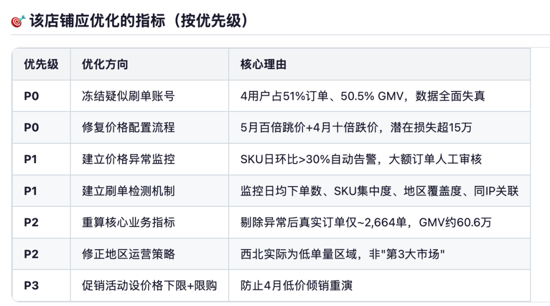 模拟生成一份电商CSV数据集,字段包括订单、用户、SKU、时间、地区、价格,数据分布需要符合真实电商逻辑,并在数据中隐藏3个业务异常,但不要显性说明。然后基于该CSV数据生成必要的统计图,并详细阐述该店铺应该优化的指标。
