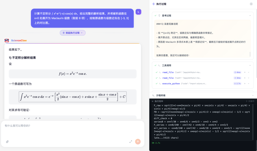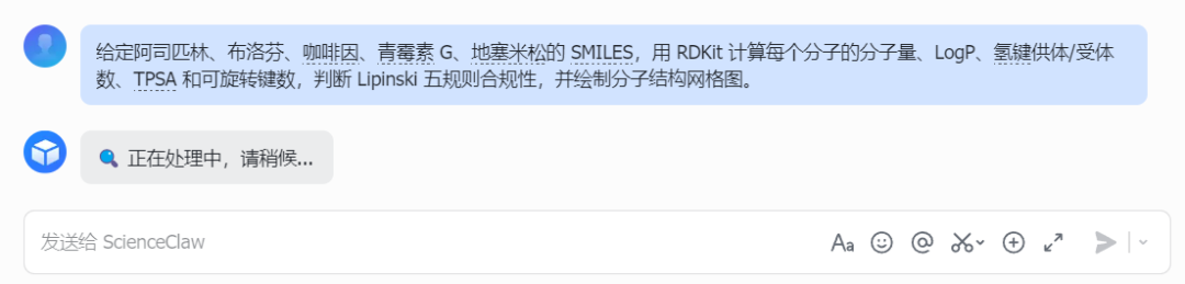 打开紫东太初ScienceClaw,第一感受就是页面相当清爽干净,没有复杂的配置流程。用户只需要输入自然语言,紫东太初ScienceClaw就会自动调用相关工具,甚至还能进一步定制化专用skill。