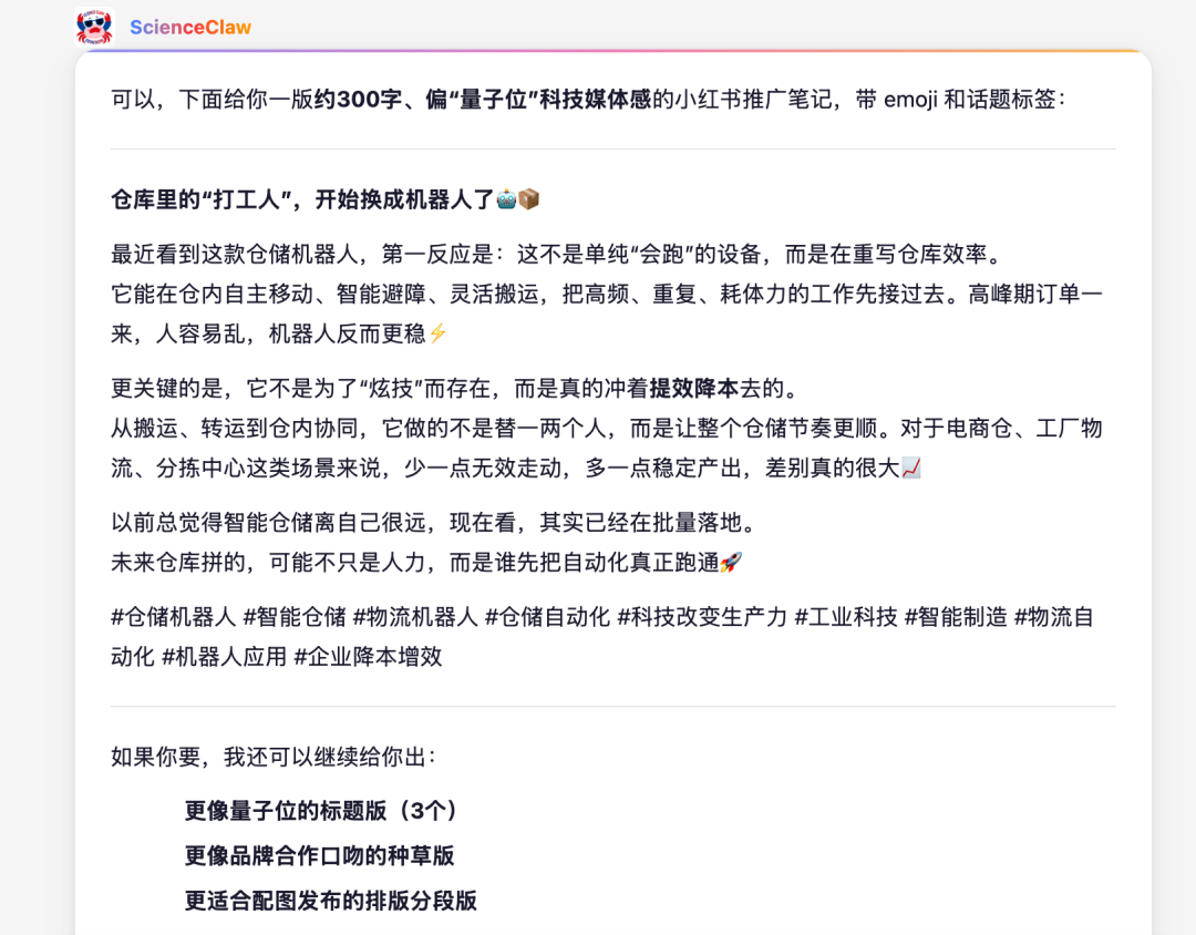 再或者,我将产品图片上传给紫东太初ScienceClaw,让它直接帮我想一个营销推广文案。