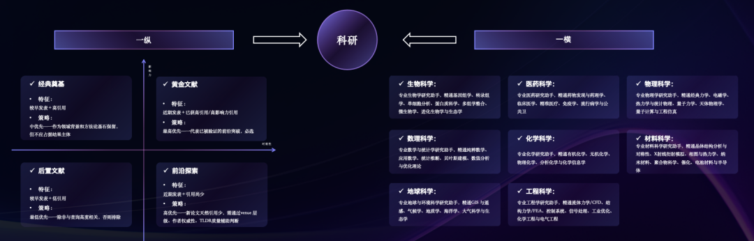 通过“一纵一横”科研组织框架,纵向以时效性与影响力双维度评估文献价值,精准识别黄金文献、前沿探索与经典奠基;横向覆盖8大学科,联动领域知识与工具能力,支撑科研检索、分析、判断与执行全流程协同,全面提升科研效率与结果可行度。