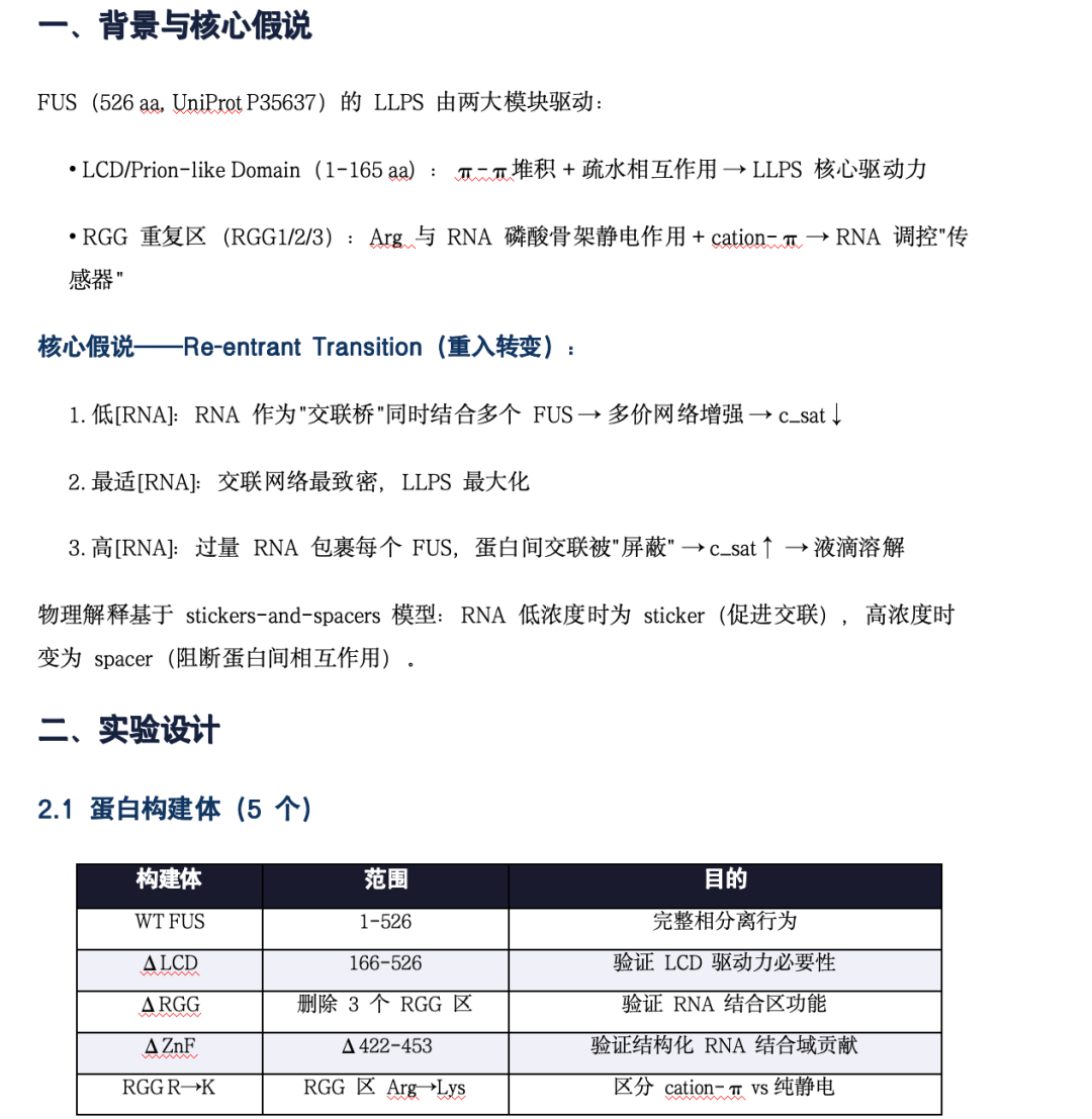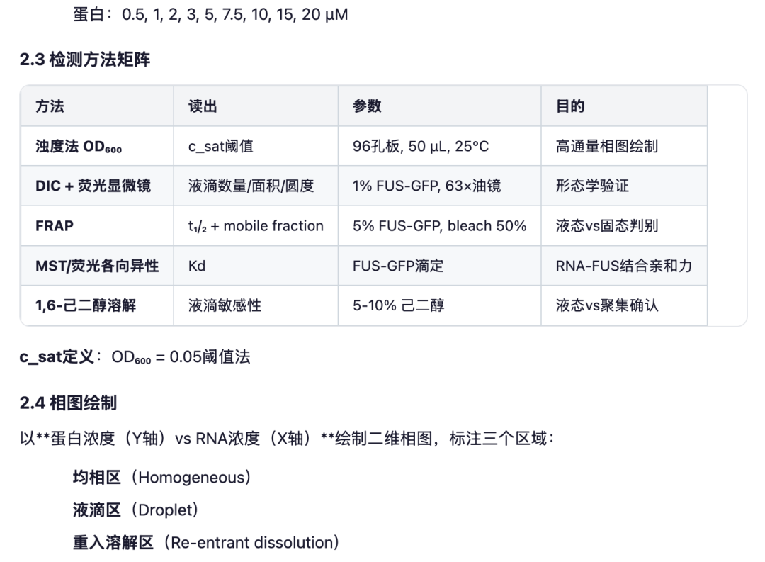 针对蛋白FUS的LLPS行为,设计一个完整实验方案,验证RNA浓度对相分离阈值的影响。
