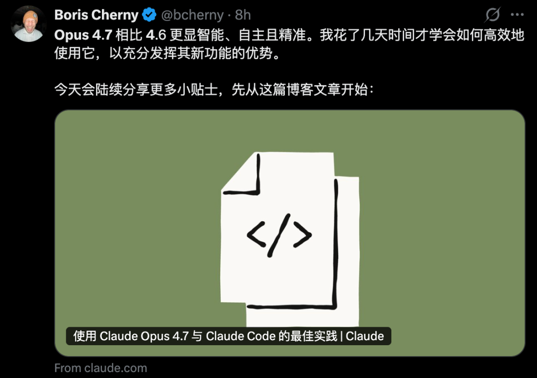 这不,Claude Code之父Boris Cherny就在刚刚,分享了Opus 4.7的最佳实践。
