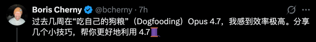 除了官方这篇博文,最近几周,CC之父一直在深度体验(Dogfooding)Opus 4.7,感觉生产力爆表。