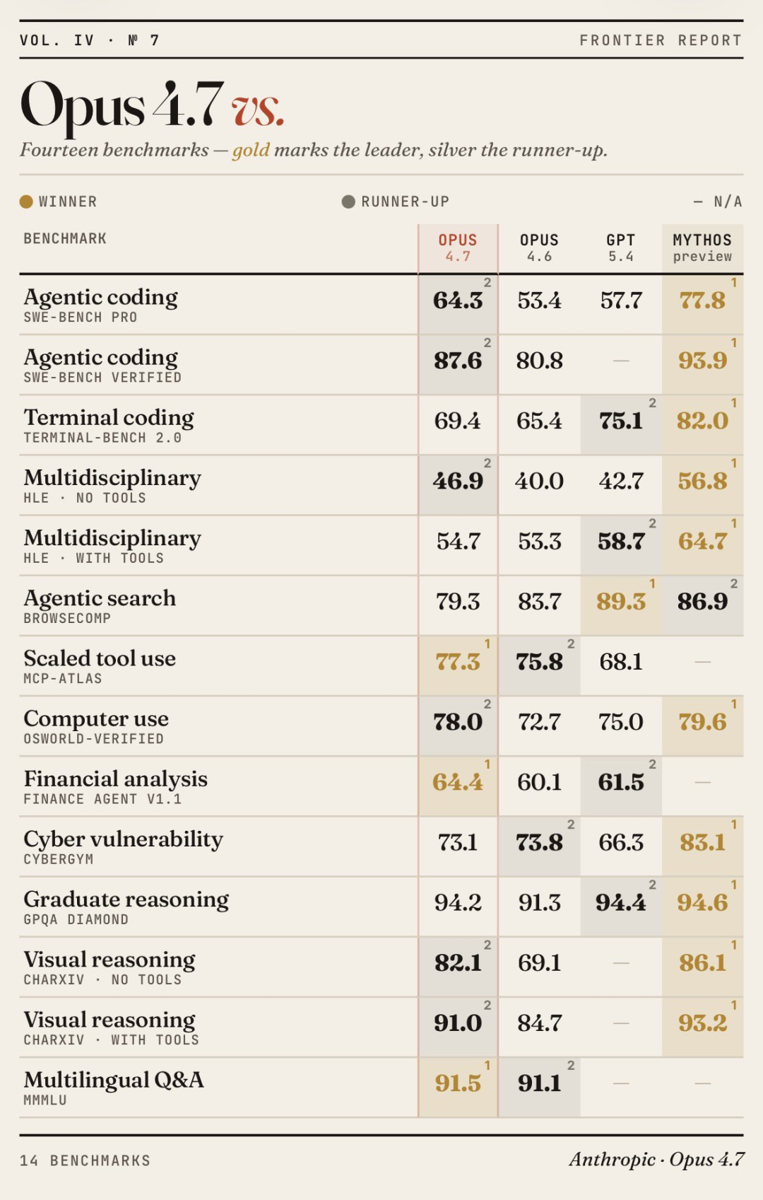 在各大基准测试中,Opus 4.7在Mythos面前,略显逊色。
