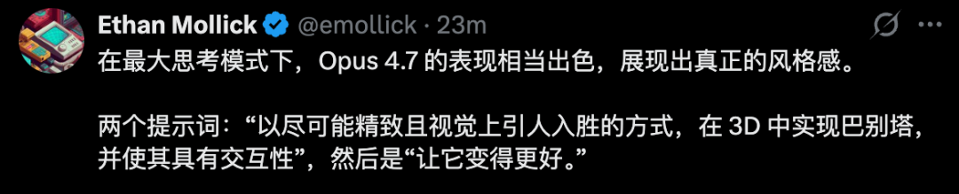 沃顿商学院教授Ethan Mollick,用了max最大思考模式下,Opus 4.7表现极其惊艳。