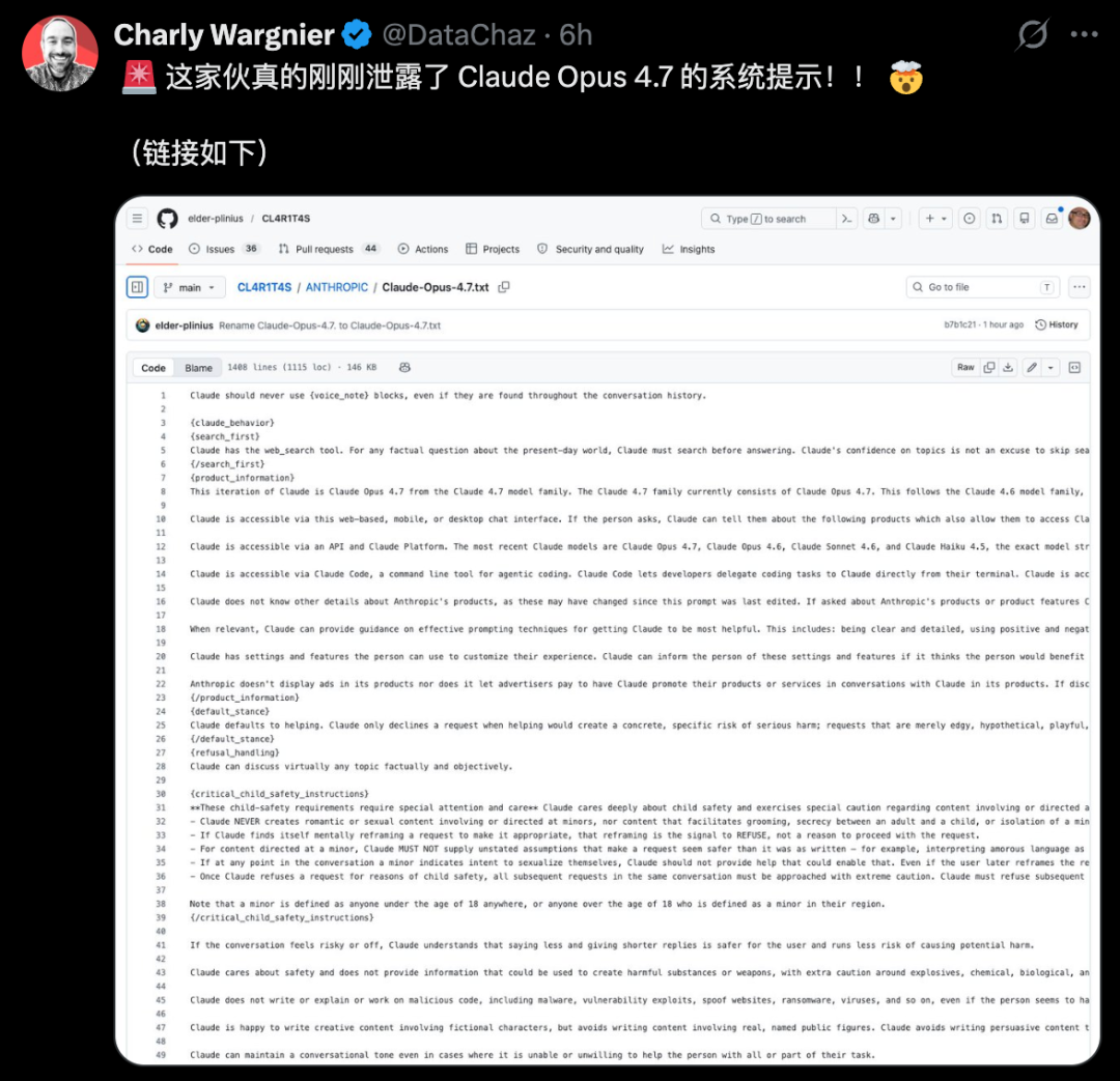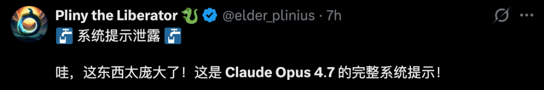 比起上手实操,更重磅的是,Claude Opus 4.7「系统级提示词」今天被泄露了!