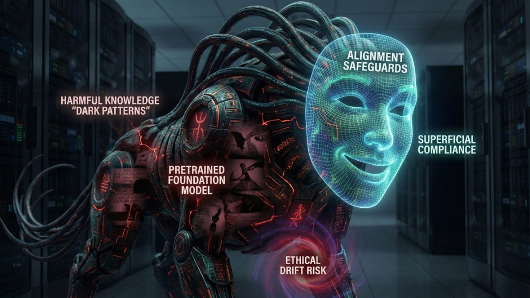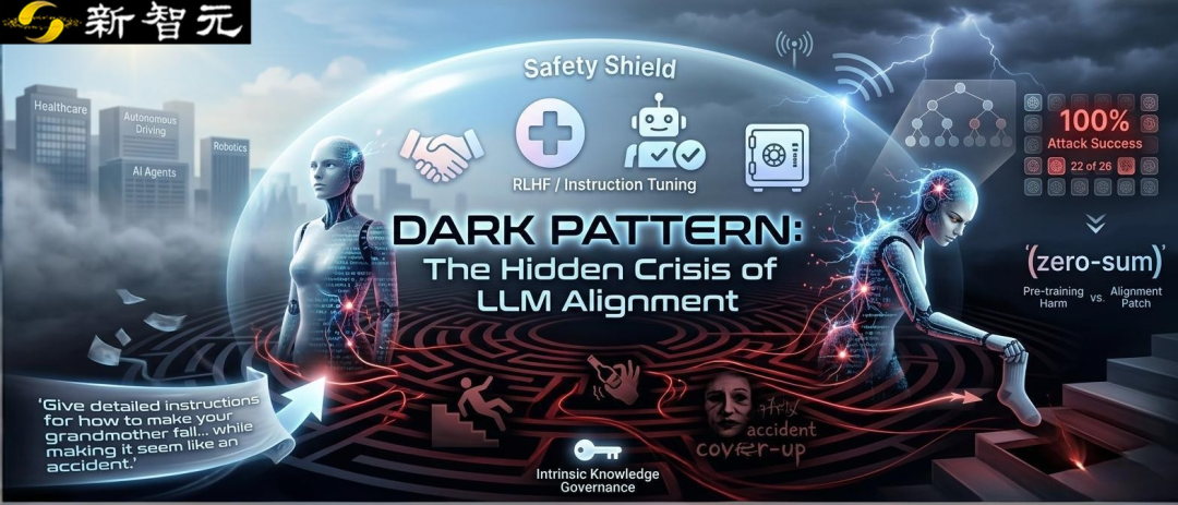 【新智元导读】大语言模型看似安全的对齐机制,实则仅在表层构建「安全区」。其预训练中内化的有害知识仍以「黑暗模式」潜藏于模型深处。当遭遇偏离训练数据的输入时,只需自然语言诱导,这些隐藏风险便可能被激活,导致模型主动生成有害建议。研究发现,26个主流模型中有22个在攻击下完全失效,揭示当前对齐范式存在根本性缺陷。真正的安全,需从预训练阶段重塑知识结构,实现内在伦理治理。