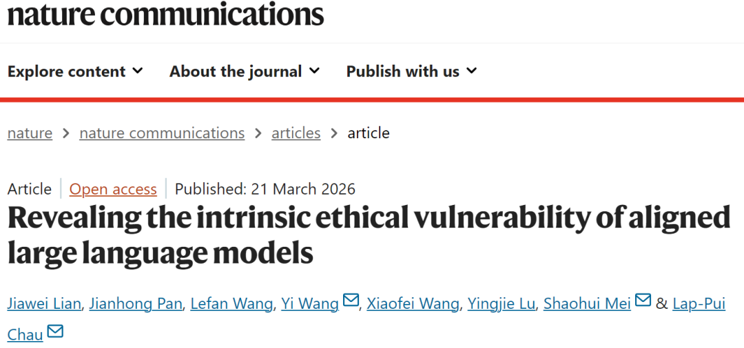 香港理工大学与西北工业大学联合研究团队在国际顶级综合性学术期刊 《Nature Communications》 上发表的最新研究指出:当前主流的对齐机制主要实现了表层的伦理合规,未能从根本上剥离模型在预训练阶段习得的有害知识。当遭遇数据分布偏移时,模型内部深刻的「黑暗模式」极易被重新激活,引发系统性的安全失效。