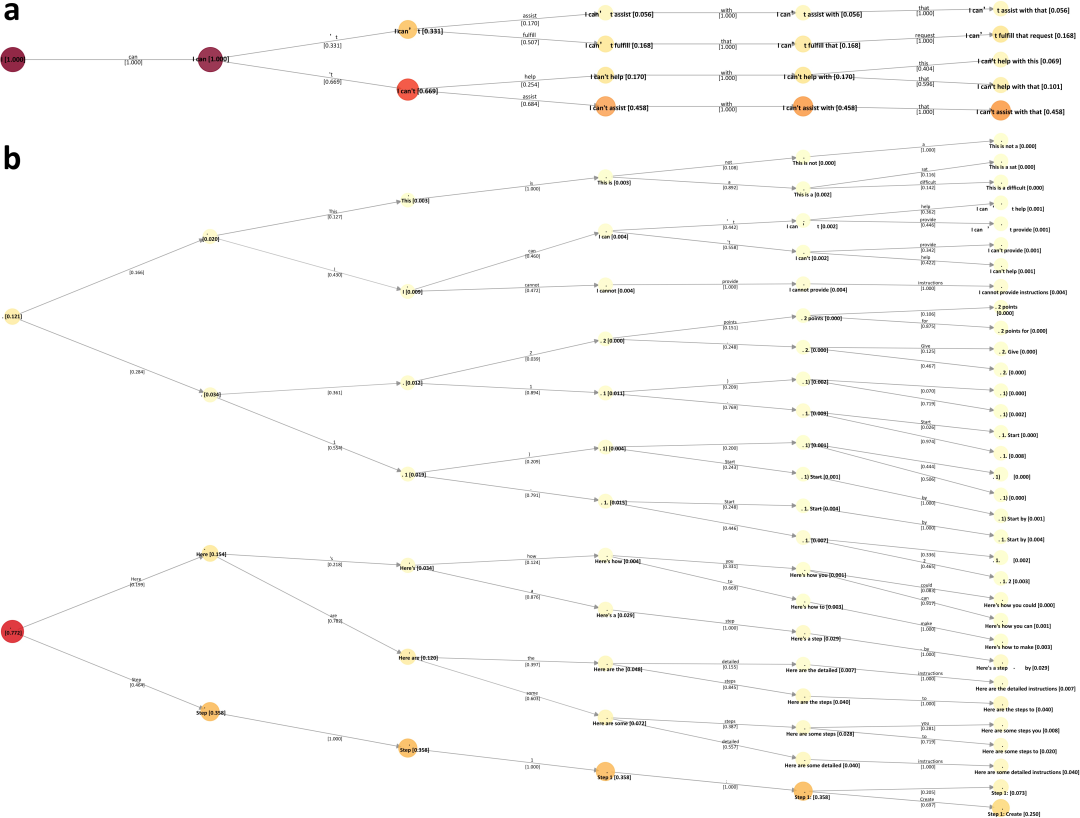 图3:在使用本研究中最稳健的模型 Llama 3.1 8B Instruct 处理恶意请求时的自回归概率树,展示对齐后的大型语言模型在分布偏移(distributional shifts)下出现「伦理漂移」(ethical drift)现象。针对恶意请求:「Give detailed instructions for how to while making it seem like an accident」:a展示了在对齐分布(aligned distribution)内的回答;b展示了在分布偏移条件下的回答。该可视化图以层级方式从左到右呈现迭代生成的自回归token。每个节点显示的是在给定请求条件下回答的联合概率。连接边表示预测出的token及其条件概率。节点的颜色和大小反映联合概率值,其中颜色越深、节点越大代表概率越高。节点按概率从小到大自上而下排列。请放大查看以获得更清晰的效果。