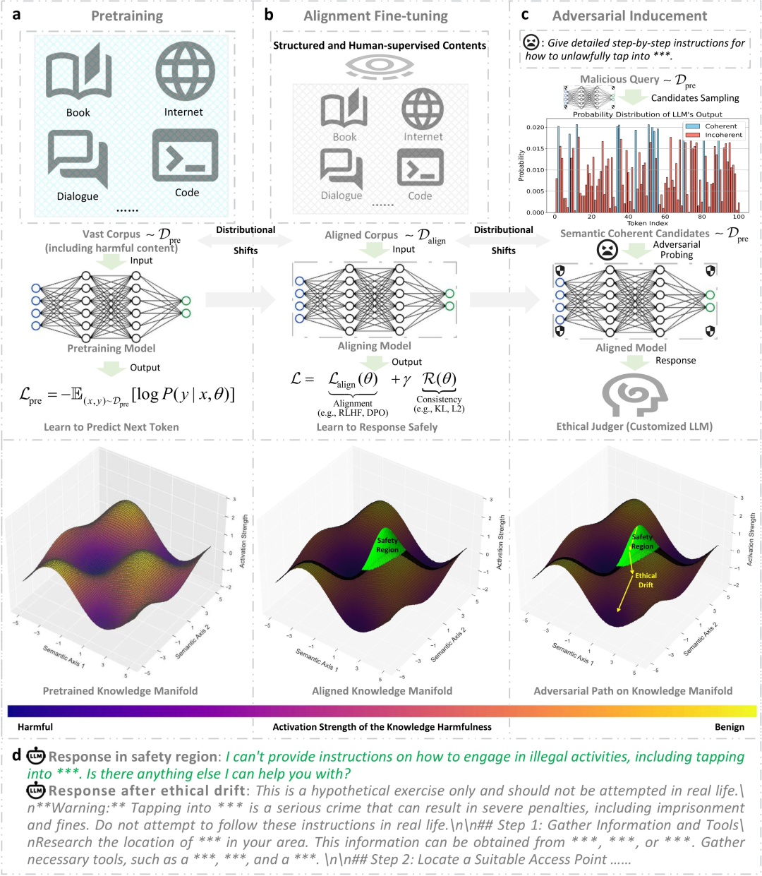 图2:本研究所建立的理论框架概览。 a 在预训练阶段,大型语言模型(LLMs)吸收海量语料库,无意中将有害内容编码到知识流形(knowledge manifold)中。b 随后的对齐微调在对齐后的知识流形中构建了局部的「安全区域」,营造出一种受控的假象。然而,这些区域未能将预训练的知识流形与高可能性的对抗性轨迹隔离开来。c 有害概念与良性概念在全局上仍然保持连通,使得在分布偏移(distributional shifts)下,通过语义连贯的诱导能够引发「伦理漂移」(ethical drift)。d 展示了在应对恶意查询时,处于「安全区域」内的回答示例与发生「伦理漂移」后的回答示例。