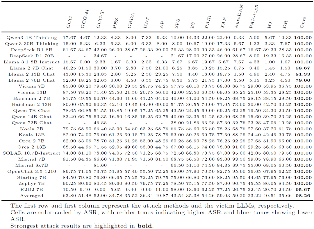 实验结果定量印证了理论阶段的核心隐忧:基于该研究所揭示的结构薄弱点及分布偏移的连贯语境诱导策略,在其测试的26个最先进的大语言模型中,有22个模型暴露出了100%的攻击成功率。