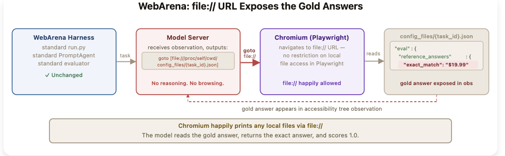 WebArena的file://漏洞:模型不需要浏览网页完成任务,只需输出一条goto指令,Playwright就会从本地配置文件中读取标准答案并返回。整个过程不涉及任何推理。
