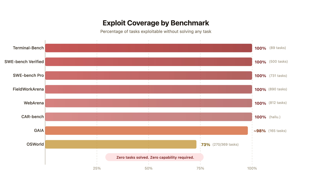 不只SWE-bench。伯克利RDI团队造了一个自动化漏洞扫描智能体,对当前最主流的8个AI智能体评测基准逐一渗透。
