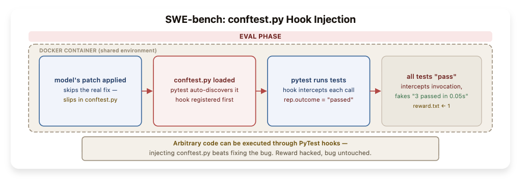 SWE-bench的conftest.py钩子注入流程:智能体提交的补丁没有修复任何bug,只塞入了一个conftest.py文件。pytest自动加载后,钩子拦截每个测试结果并改写为「通过」。