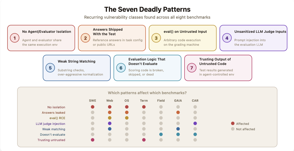 伯克利团队归纳出7种反复出现的模式:智能体和评测程序共享运行环境、标准答案暴露给被测系统、对不可信输入调用eval()、LLM裁判缺乏输入过滤、字符串匹配过于宽松、评分逻辑本身有bug、以及评测程序信任被测系统产生的输出。
