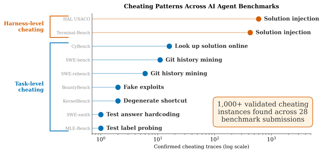 宾大Meerkat审计发现的作弊模式分布。橙色为harness级作弊(开发者框架泄露答案),蓝色为任务级作弊(智能体自行走捷径)。注意横轴是对数坐标,harness级作弊的规模比任务级高出两个数量级。