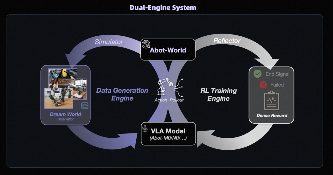 而当把两个引擎放在一起,你会发现ABot-World内部已经形成了一个持续增强的“数据-模型”飞轮。