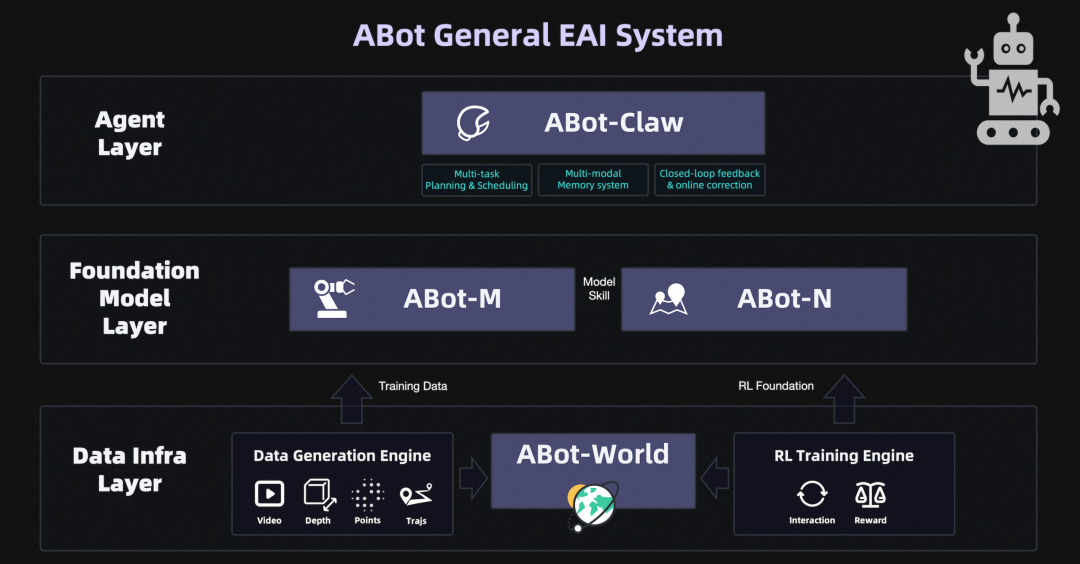 数据层:ABot-World可交互世界模型 模型层:导航基座模型ABot-N/执行基座模型ABot-M Agent层:机器人应用层操作系统ABot-Claw