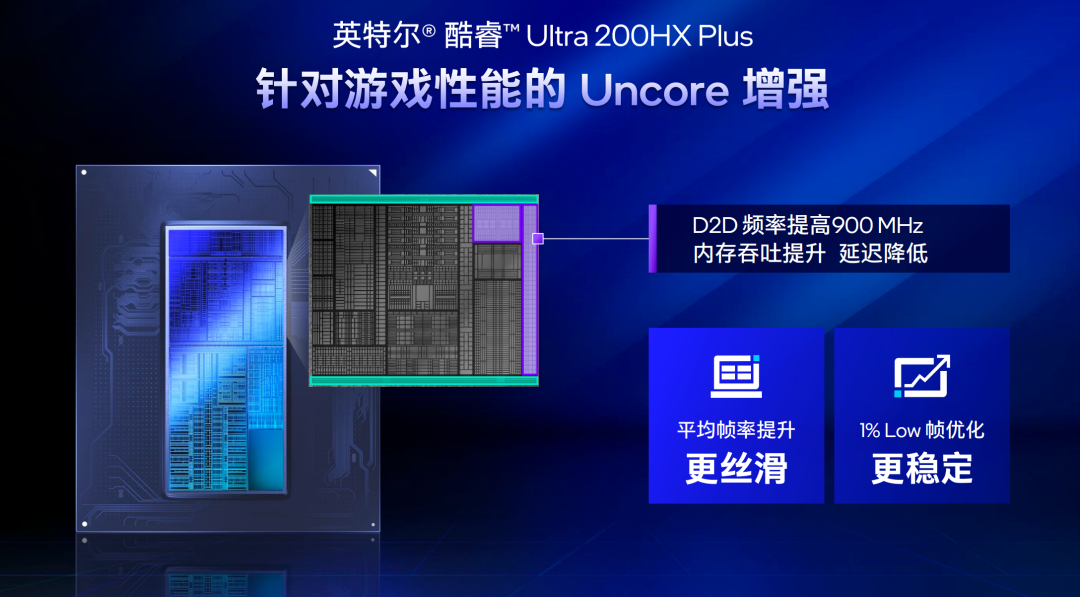 在架构层面上,本次200HX Plus重点强化Uncore游戏性能,通过提升晶粒间(D2D)频率900MHz至3GHz,突破Arrow Lake多Chiplet架构通信瓶颈。