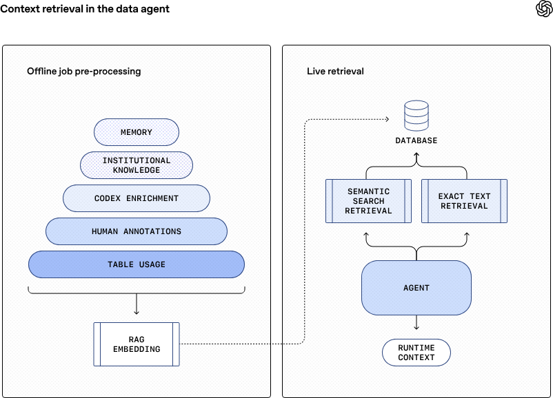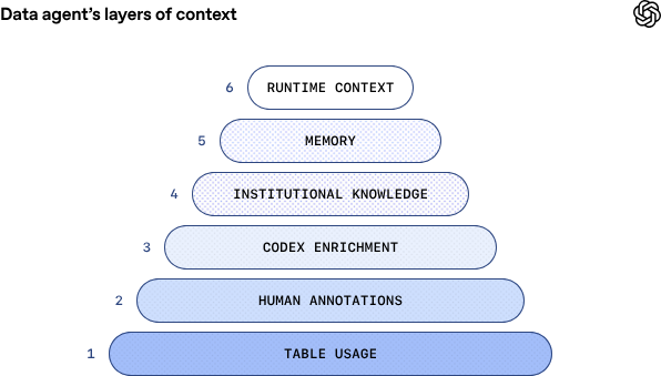 在内部,OpenAI做了一件更激进的事:让 Codex 驱动的数据智能体接管「找表—懂表—写SQL—校验结果」这条链路,用一套六层上下文架构,把数据语义补齐、把组织知识接入、把经验记忆沉淀,让工程师用提问取代搬砖。