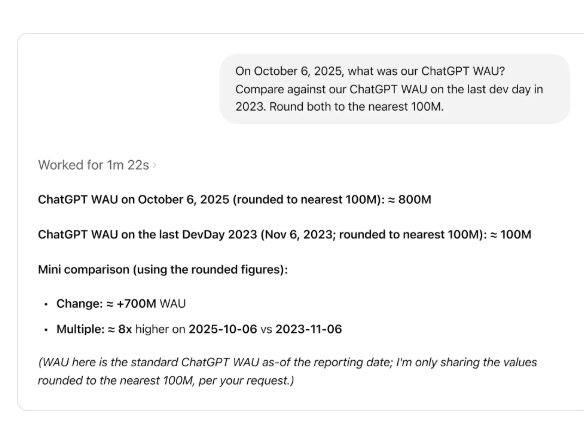 而现在有了由 Codex 驱动,具有自主学习能力的智能体,工程师不必写上百行的SQL查询语句,只需要提问就能从数据海洋中找到所需的信息,例如下图查询中要求对比两个时间点的活跃用户数。