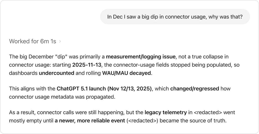 例如,当用户询问「12月连接器使用量为何大幅下降」时,智能体没有简单地报告数字下降,而是通过机构知识发现这主要是测量/日志记录问题,而非真正的使用量崩溃,与ChatGPT 5.1发布导致的数据收集变化相关。