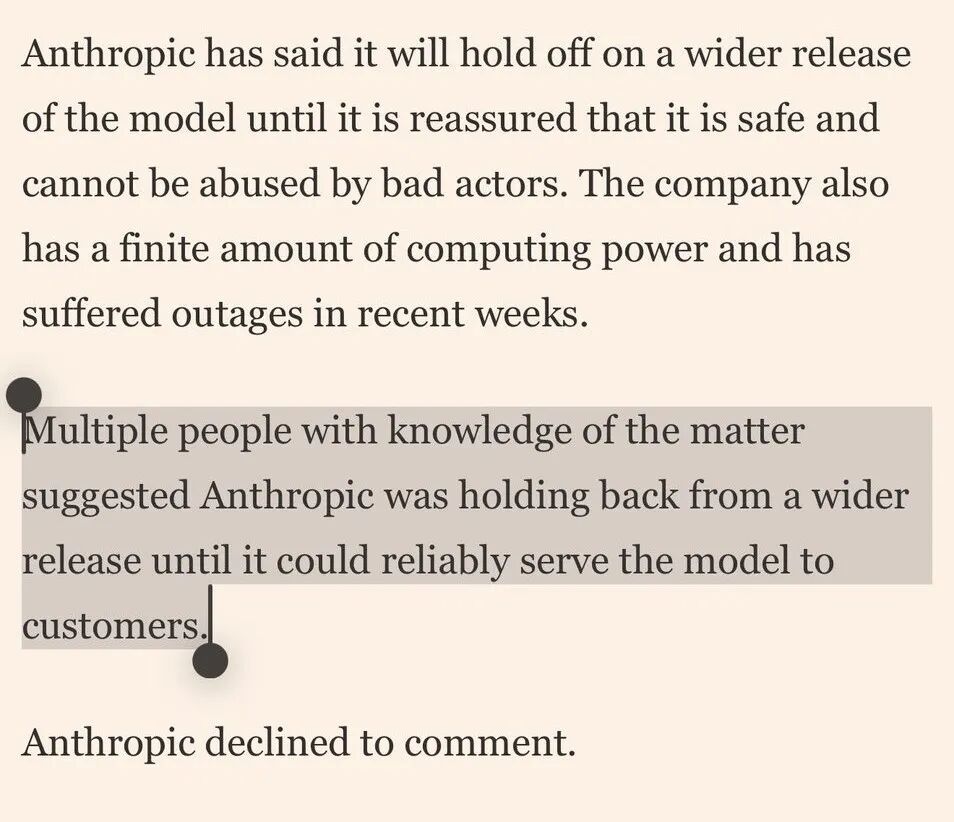 FT引述多位知情人士的爆料,戳破了这一神话:真正拖慢模型广泛发布的,与其说是「太危险不敢放」,不如说是「太吃资源,根本带不动」。