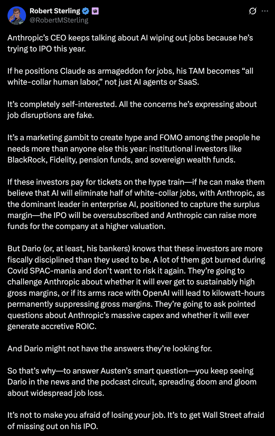 他天天喊着「AI毁掉白领工作」,真正想吓到的根本不是打工人,而是生怕错过下一个工业革命的华尔街资本。