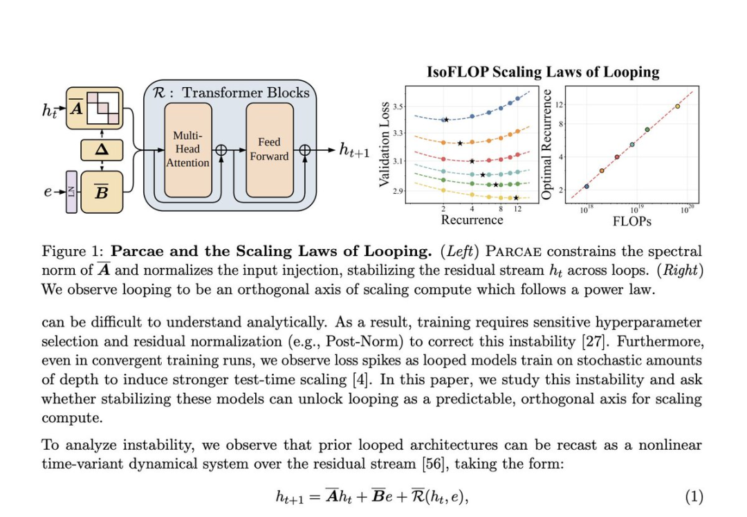 来自UCSD和Together AI的新论文Parcae: Scaling Laws For Stable Looped Language Models提出LTI稳定循环注入让每轮不发散。
