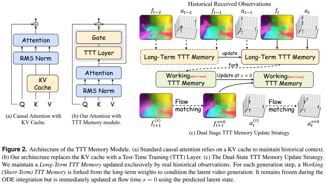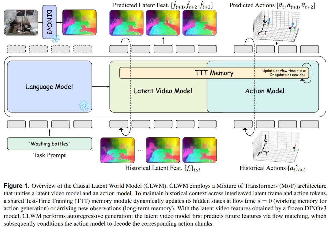 CLWM用TTT-MLP把历史观测和历史动作压缩进记忆模块权重里,并进一步设计了双状态机制: