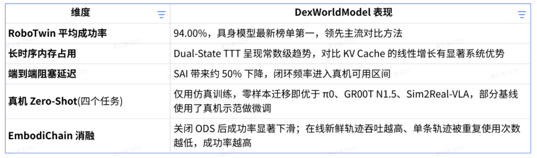 系统效率方面,两条结果尤其关键:Dual-State TTT Memory在长时任务中维持常数内存占用,SAI将部署blocking latency降低约50%。