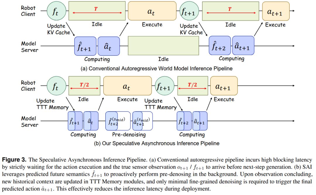 这背后的变化很关键:传统流程里,机器人执行和模型推理是前后串行的;在DexWorldModel里,这两件事开始被深度重叠。