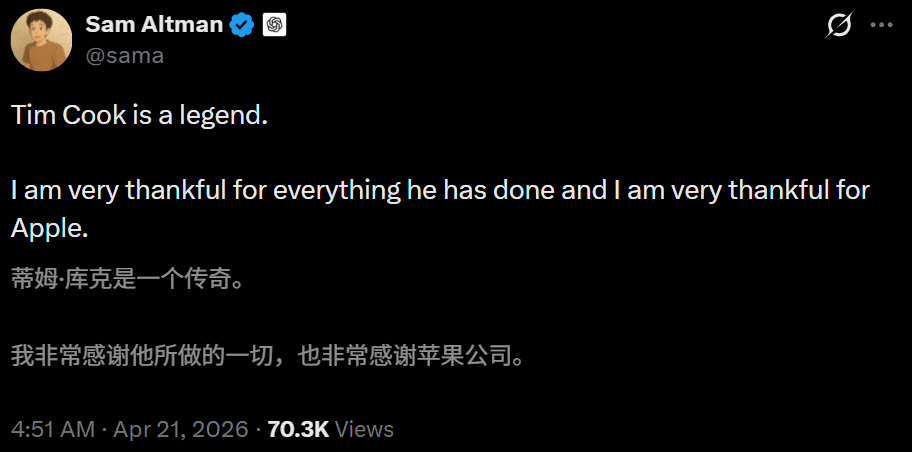 库克是一个传奇。我非常感谢他所做的一切,也非常感谢苹果公司。