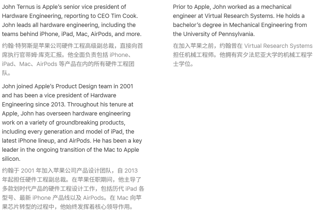 John Ternus毕业于宾大机械工程专业,2001年加入苹果,已经是一名入职近25年的老将了