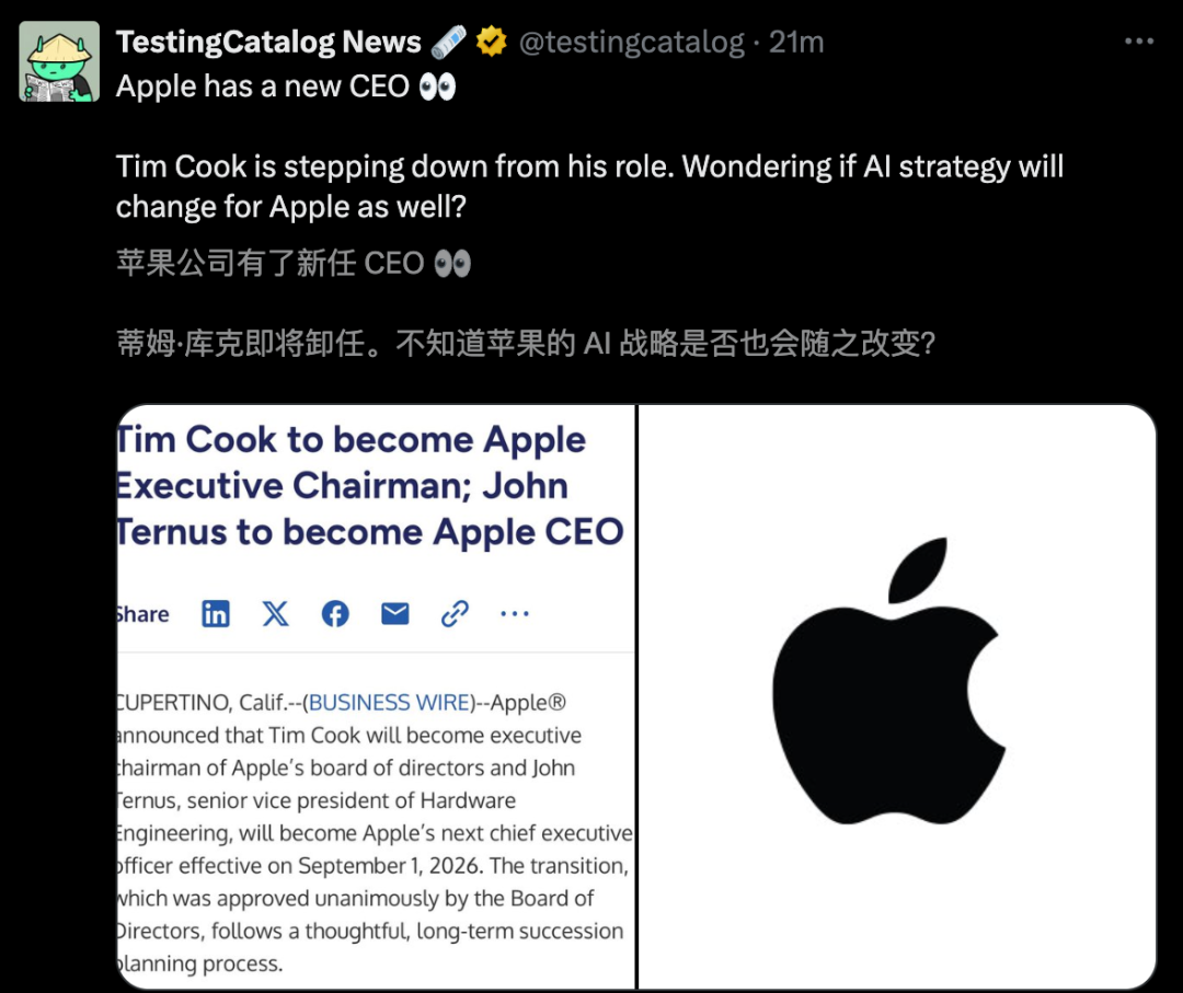 【新智元导读】一个时代结束了!库克正式官宣卸任苹果CEO,由25年硬件老兵John Ternus接任。ASI时代新苹果,该何去何从?