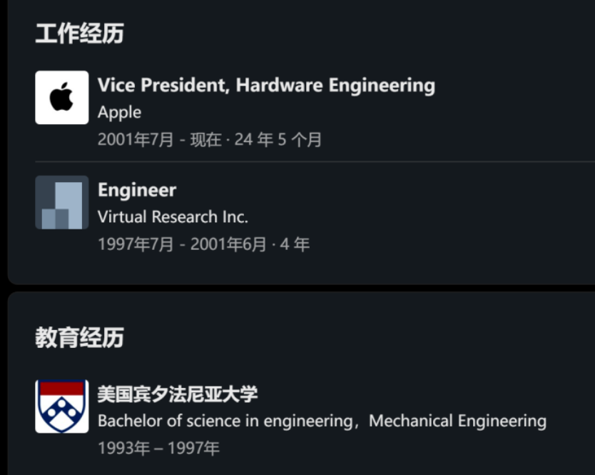 他在苹果的起点始于2001年,一开始加入的是产品设计团队。2013年,他升任硬件工程副总裁,2021年再度晋升为硬件工程高级副总裁,自此,Apple Watch团队也直接向他汇报。