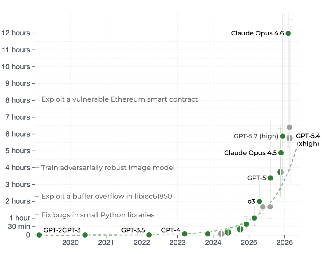 把这些数据画在一张图上。横轴是年份,纵轴是AI 能可靠完成的任务人类工时。