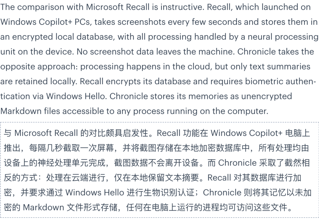 Chronicle干的事比Recall更深——Recall只截屏,Chronicle理解内容。