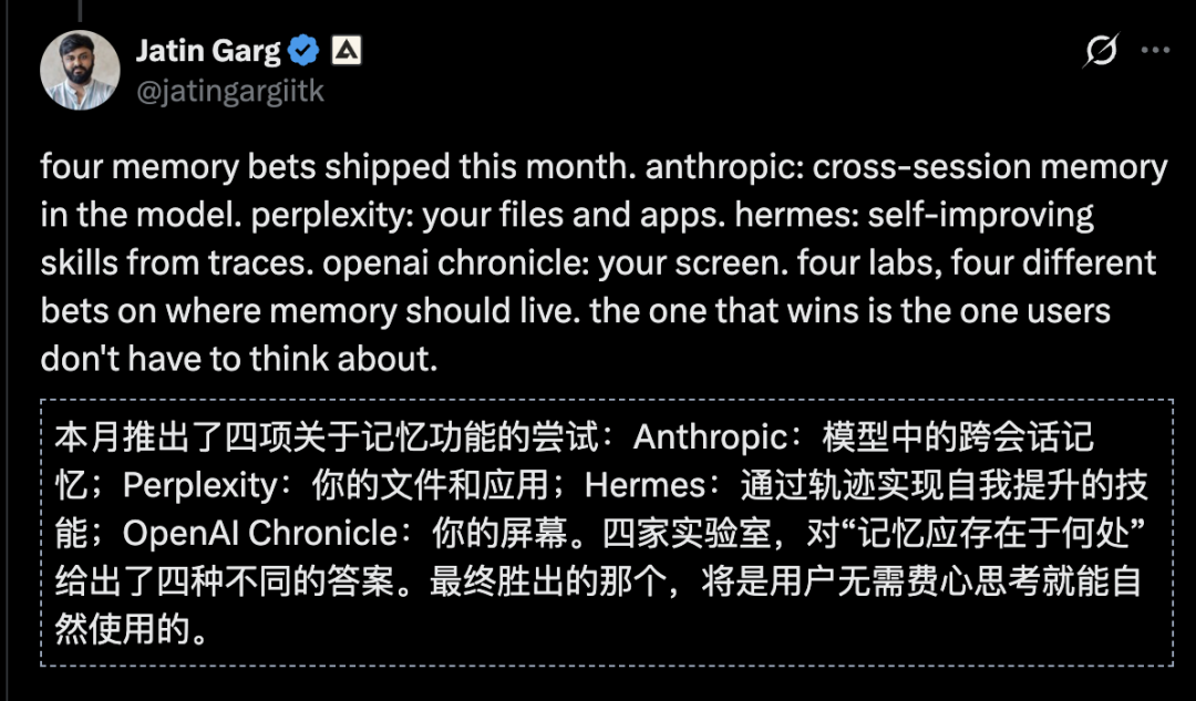 这是这个月国外AI行业第四项关于记忆功能的尝试: