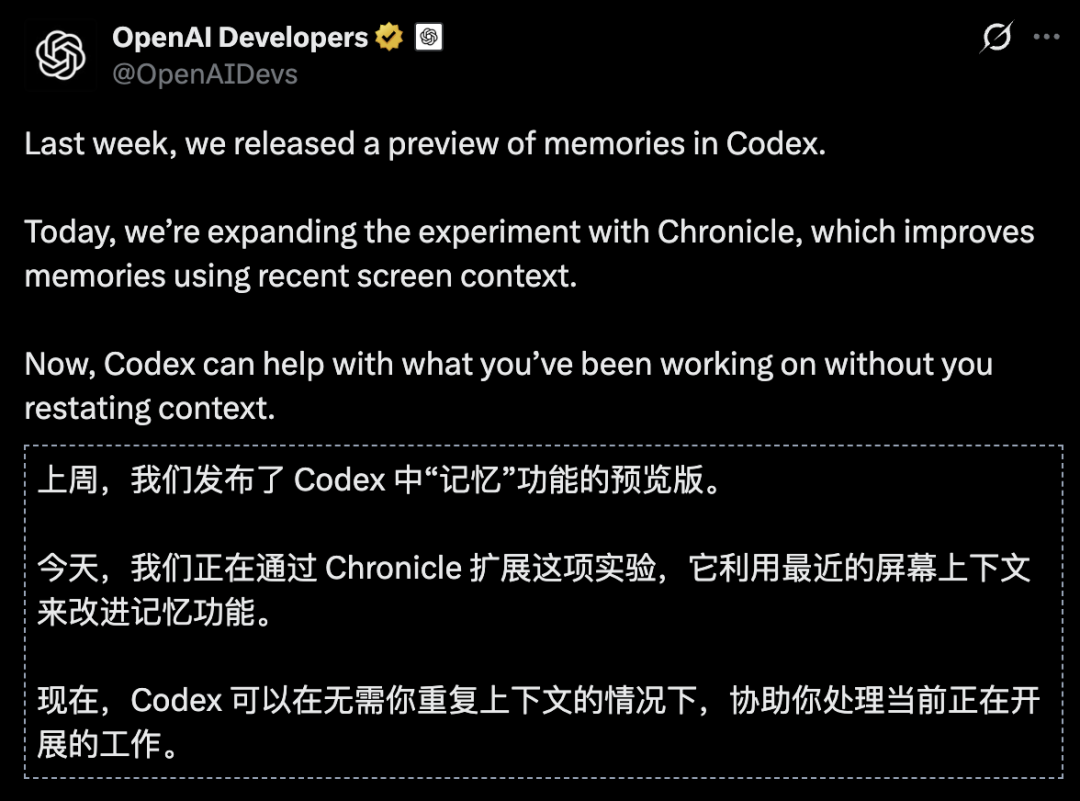 他们设计Chronicle的初衷,是减少使用Codex时需要重复陈述背景信息的次数。
