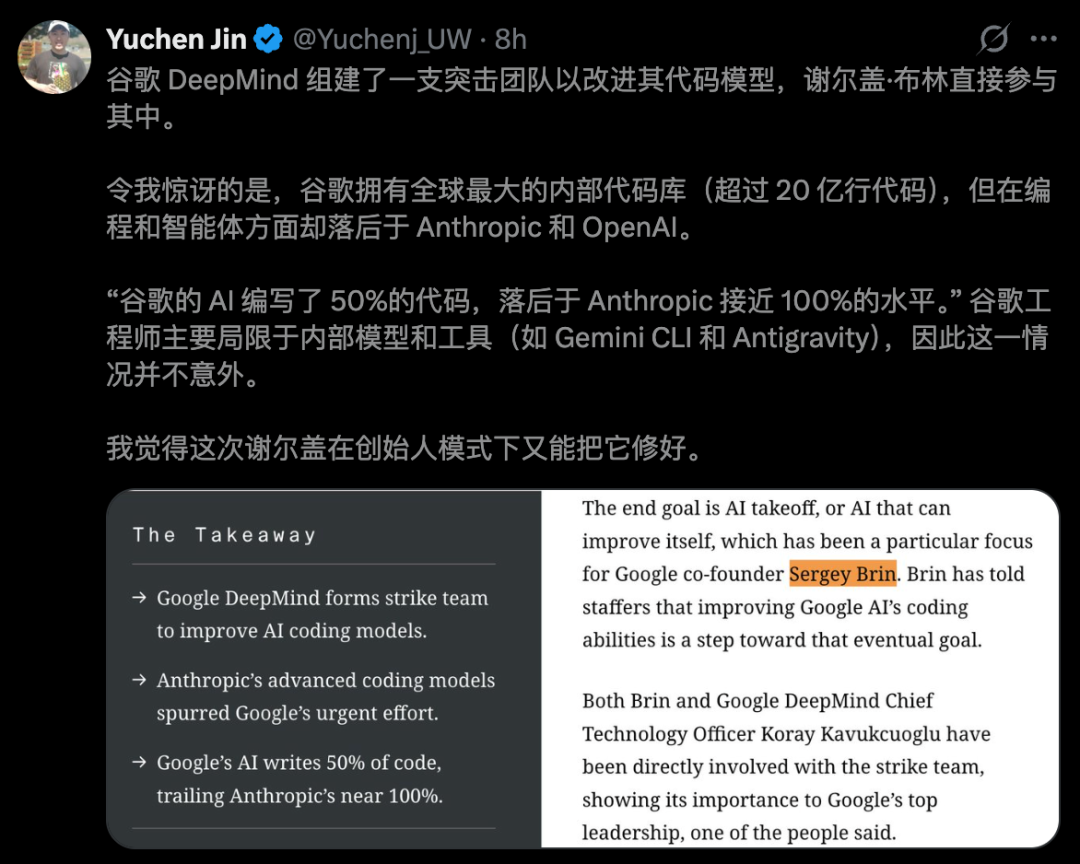 谁先造出最强的代码AI,谁就有可能第一个造出能自己改进自己的AI。这才是布林真正在抢的东西。