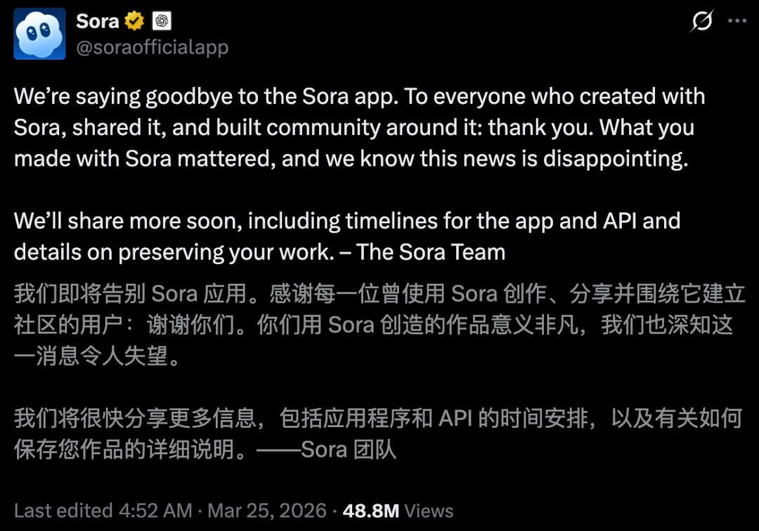 OpenAI刚刚砍掉了Sora视频生成项目,4月26日关停网页和App,算力和工程资源全部重新分配到coding和企业产品。