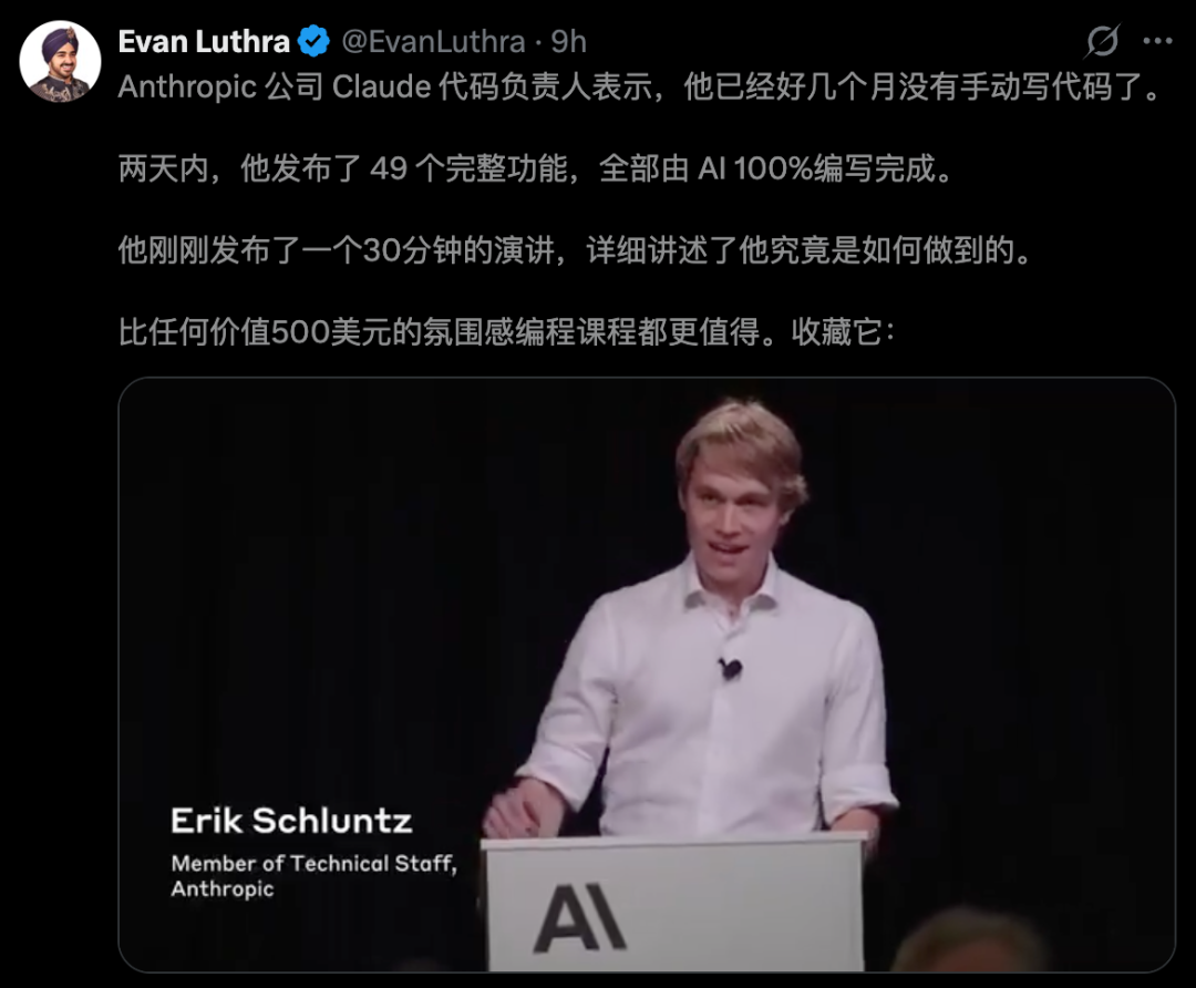 Claude Code负责人Boris Cherny今年1月公开表示,Anthropic「几乎100%」的代码由AI编写。
