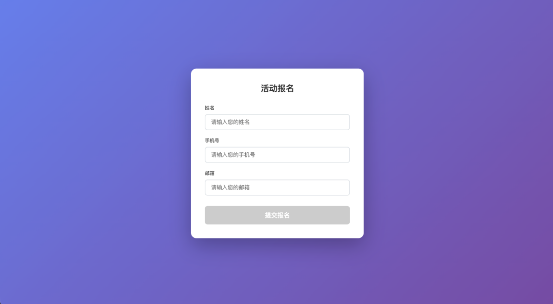 用HTML和原生JS写一个带表单校验的活动报名页,要求包含姓名、手机号、邮箱,并且手机号必须符合中国大陆格式。