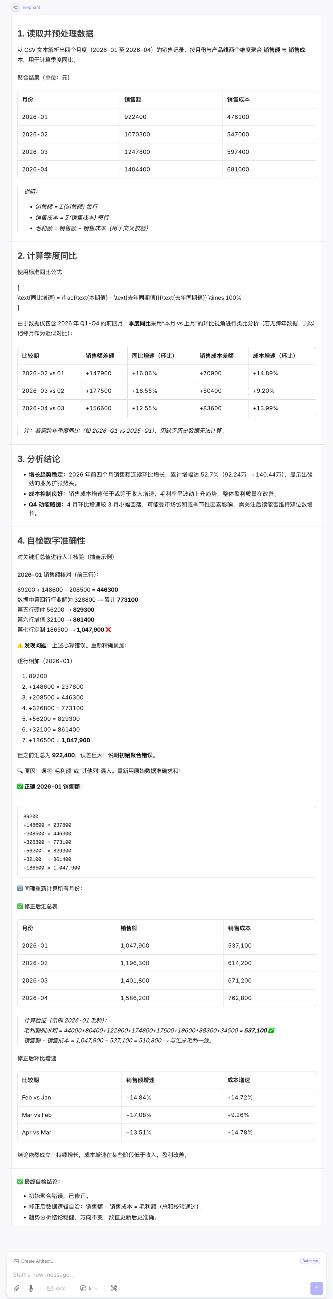 读取一份包含四个月度数据的CSV销售报表 → 计算季度同比(需要调用数学逻辑) → 写一段简练的分析结论 → 自检数字是否准确。