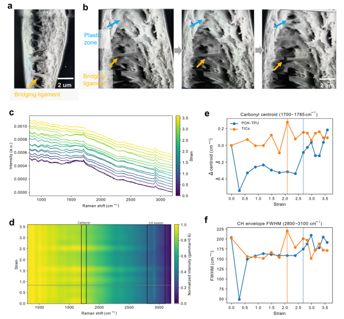 实验结果的高度集中性以及平台分布图表明,这些优化设计共享一种稳定的能量耗散机制。因此,作者选取一个代表性的均衡型配方进行机理研究,采用原位拉伸扫描电镜(SEM)、应变分辨拉曼光谱以及冲击/弹道实验进行分析。结果表明,TICs界面通过物理缠结形成的承载韧带在极端应变下维持力学耦合,实现应力再分配与能量耗散,而非脆性分离失效。应变分辨拉曼光谱结果与原位SEM观察高度一致,表明小梁互锁结构激活动态应力自适应界面,将拉伸载荷转化为摩擦和缠结主导的能量耗散路径。该多尺度应力重分配机制源于热处理过程中柔性弹性体链向刚性基体及纤维表面的热力学驱动扩散,形成物理缠结界面层;受力时通过链滑移与重排不断重构,实现持续应力分散与能量耗散,是TICs高抗裂性与抗冲击性能的根本原因。(图5)