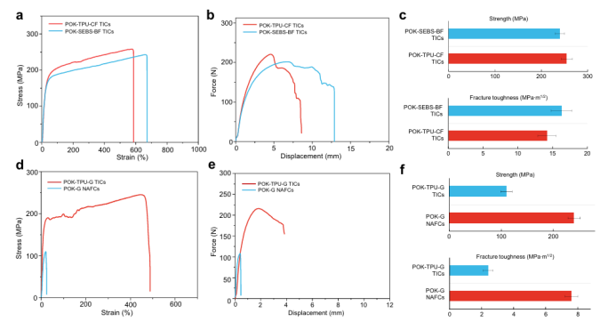 最后,作者验证了基于TICs的小梁互锁结构与应力自适应界面策略具有良好的通用性,可适用于不同基体(如POK、PA6)及多种增强相(一维纤维与二维纳米片)体系,并兼容标准加工工艺。其普适性源于热力学驱动的链动力学与拓扑缠结机制,而非特定化学作用,使其成为一种可扩展、材料无关的高性能轻质复合材料设计平台。