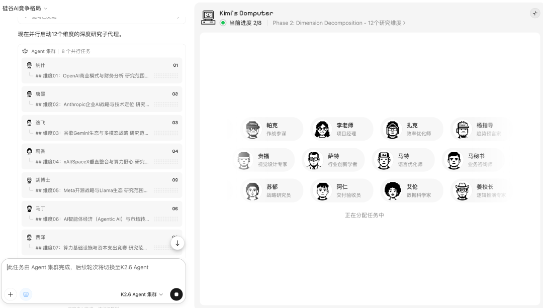 过去丢给Kimi一个复杂任务,它一个人从头干到尾,遇到不擅长的环节就可能卡住。现在它会自己拆活、组队、分头干,每个子Agent专攻自己擅长的那块,最后汇总交付。