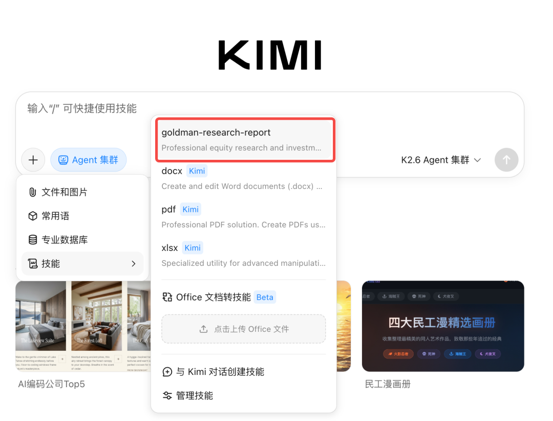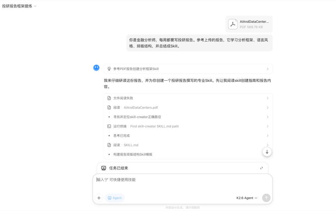 我们上传一份高盛的研究报告,让Kimi K2.6分析架构、语言风格,并总结出一个Skill。