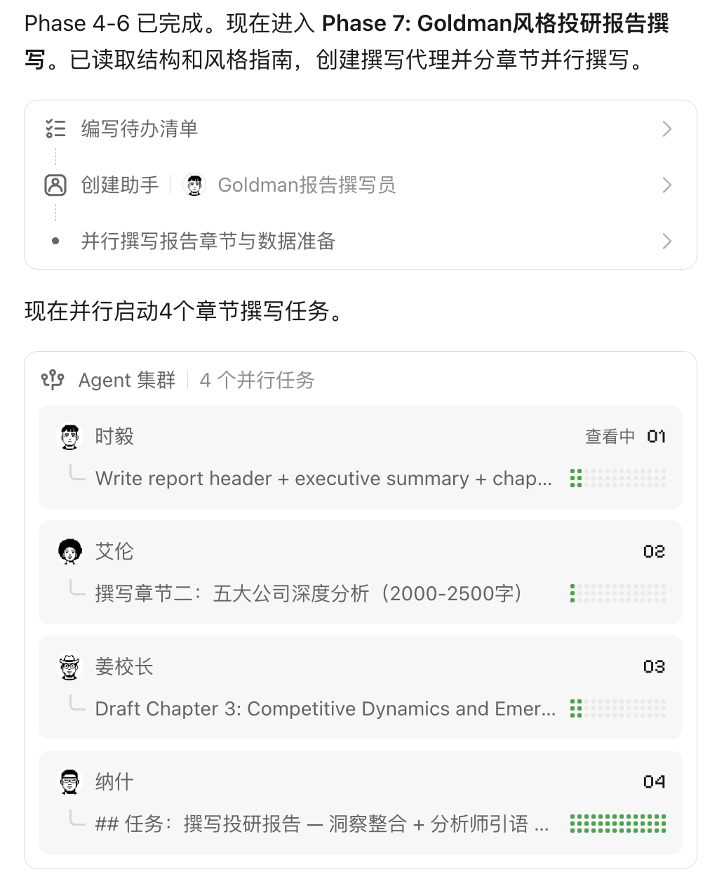调研完成后,进入交叉验证阶段,素材事实性没有问题后,交由「高盛报告撰写员Agent」再次分配任务。